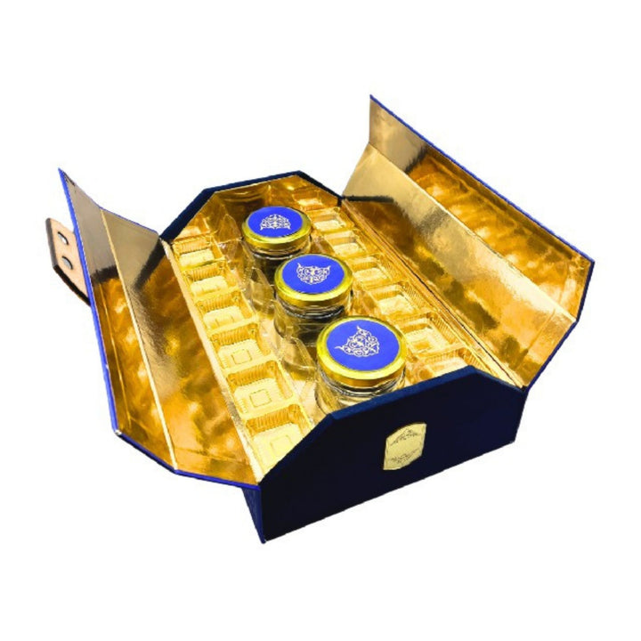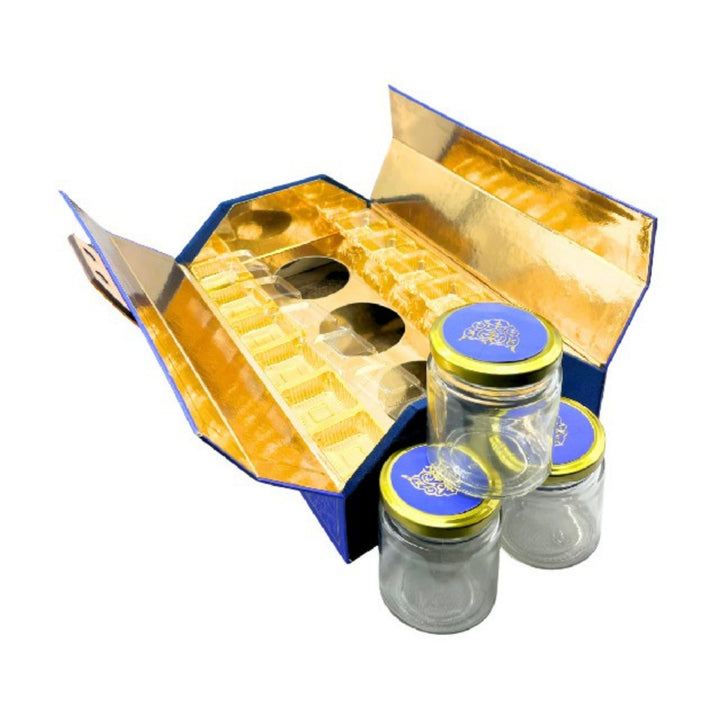 Material : MDF + Kappa Board Velvet + Acrylic + Ribbon Printed Paper + Lamination Foil + Embossed UV + MagnetAccessories : 3 Jars & Cavity